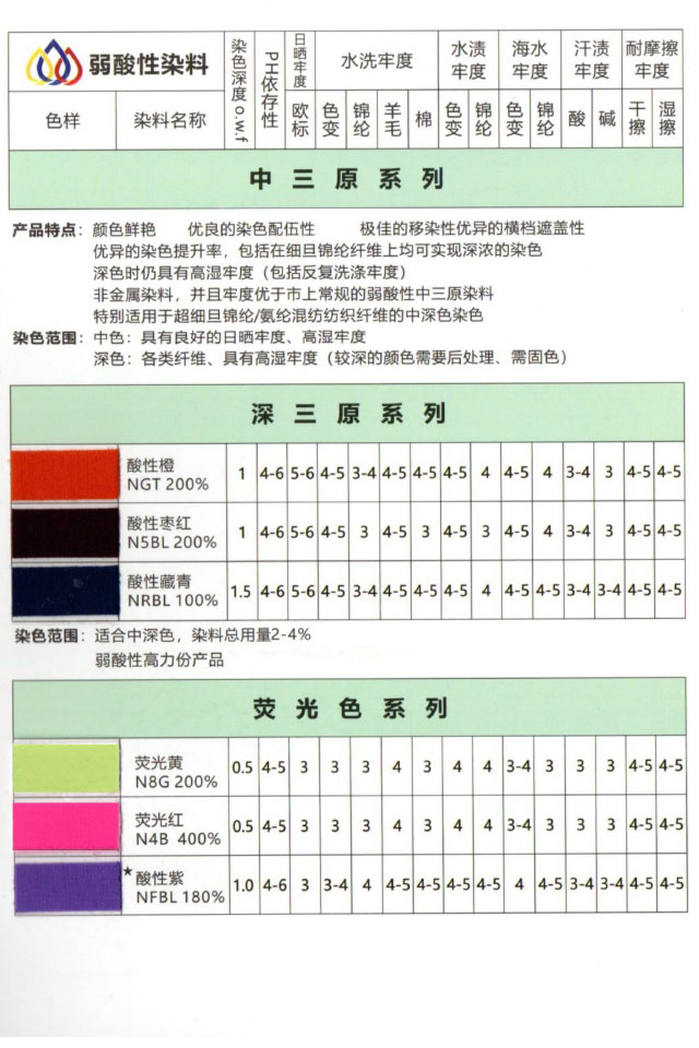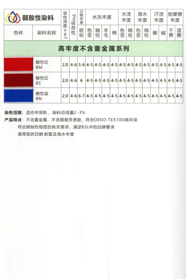 高牢度分散染料作為合成纖維染色的核心材料,以分子結構小、不含水溶性基團為特征,需借助分散劑實現(xiàn)均勻染色。其技術特性聚焦于色牢度提升,涵蓋耐洗、耐光、耐摩擦、耐升華等多維度性能,采用五級制評級體系(耐光牢度為八級),級數(shù)越高代表性能越優(yōu)。例如,蒽醌結構染料因分子穩(wěn)定性高,耐曬、耐熱性能顯著;偶氮…